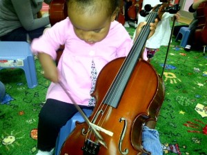 I’d always had a little fanasty that one day, I’d play my full size cello, and my kid, a quarter-size model, that we’d create music together…seems like that vision is catching up to me. Sure, Julia might be sawing on might  a violin, and not a mini cello. Maybe. But either way it leads me to wonder what other tricks does Miss Julia have up her onesie.